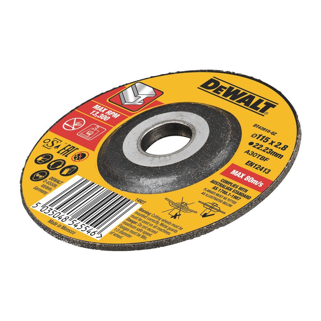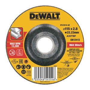Domov » Náradie » Príslušenstvo » Kotúče » Pre uhlové brúsky » Rezné kotúče » Na kov » Jednokusové balenia » Dewalt DT43910 – Rezný kotúč na nerez 115×22,2×3,0mm, typ 27 – vypuklý
