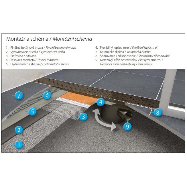 Krycie rošty sú ponúkané v niekoľkých elegantných radoch, môžete vyberať z veľkého množstva designov. Miesto na rošt môžete osadiť dielom s možnosťou vloženia dlaždic. Sifón, ktorý používame nepotrebuje žiadnu údržbu, má samočistiacu funkciu. Smerovo si ho tiež nastavíte tam kam potrebujete, iba jeho pootočením. Nevyhovuje Vám dĺžka – aj to u nás riešime. Pomocou formulára na našich stránkach sa opýtajte výrobok na mieru priamo pre Vašu kúpeľňu.