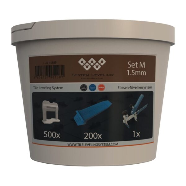 Kompletná nivelačná sada obsahuje 100 kusov spôn, 100 kusov klinov, 1 nivelačné kliešte. Spony majú hrúbku 3 mm. Sada je vhodná pre hrúbku dlaždíc 3-12 mm, kompatibilná s akýmkoľvek materiálom. Súčasti sú 100 % symetrické a zaručujú podlahu bez nerovností. Balené v kartónovej krabici.