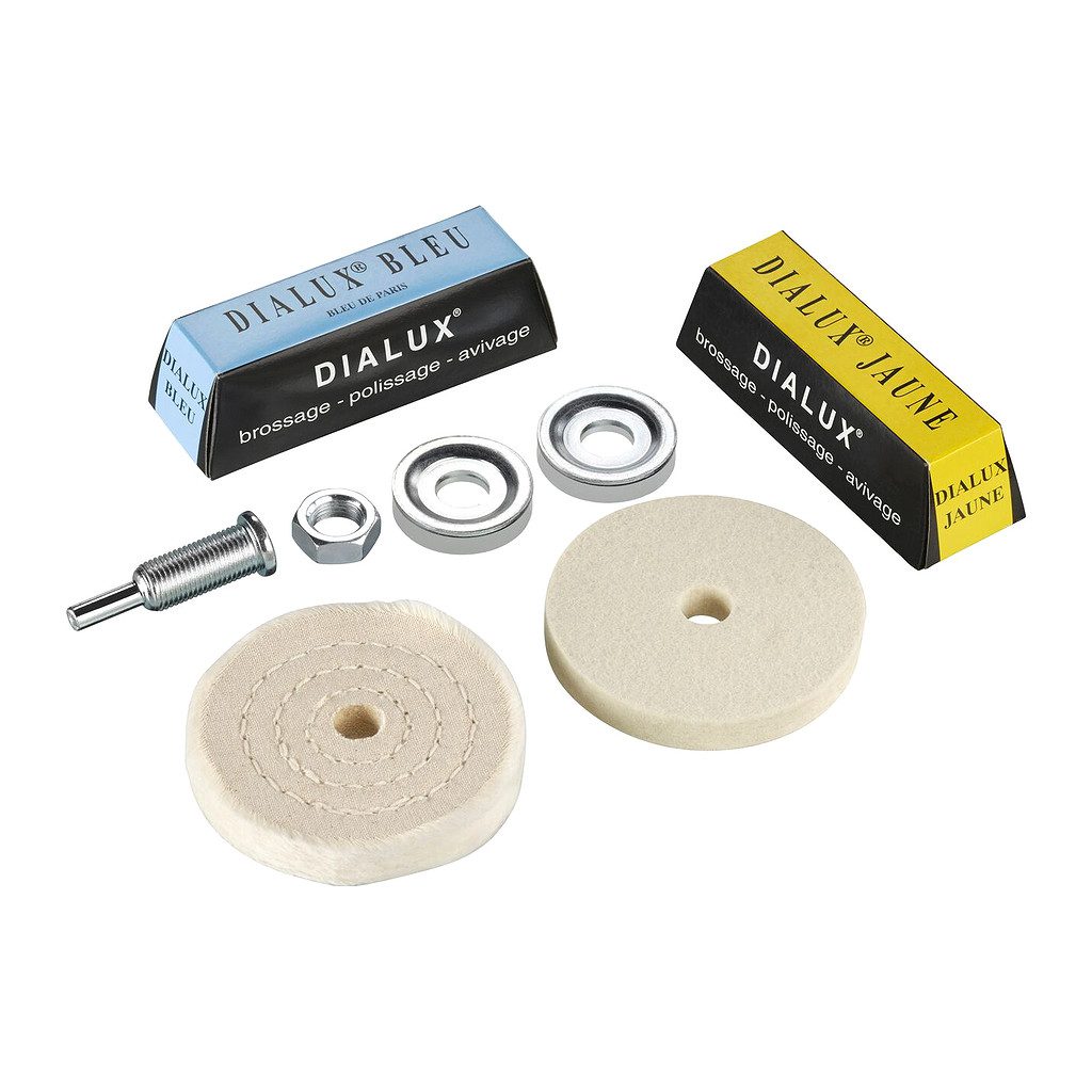 • plstený leštiaci + vrst.bavlnený leštiaci kotúč Ø75mm + upínací hriadeľ so stopkou