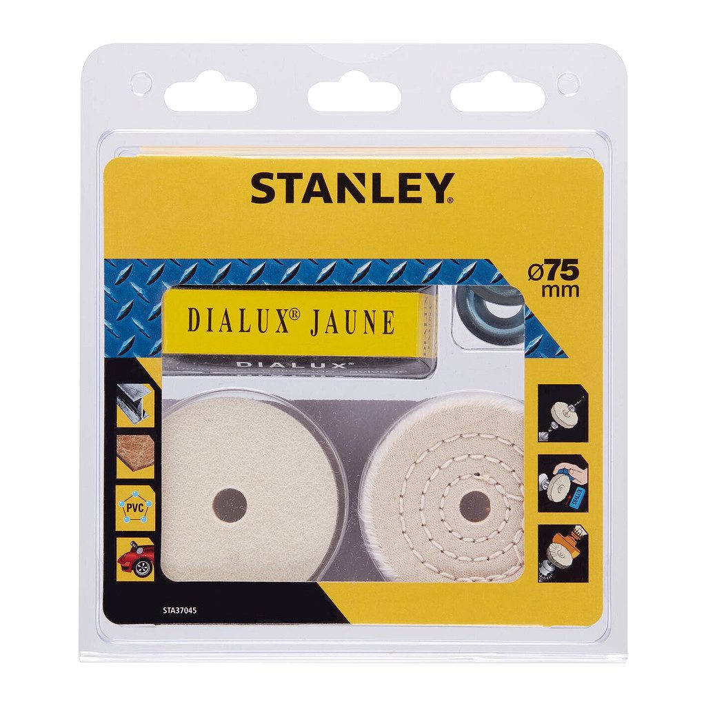 Domov » Náradie » Príslušenstvo » Pre brúsky » Pre uhlové brúsky » Nadstavce » Stanley STA37045 – Kotúč do vŕtačky, plstený leštiaci + vrst.bavlnený leštiaci kotúč Ø75mm + upínací hriadeľ so stopkou, 3ks