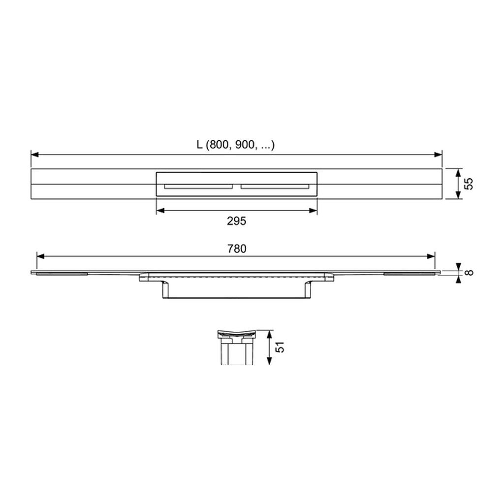 • Sprchový profil, ktorý možno podľa potreby dĺžkovo skracovať s vnútorným spádompre zlepšenie odvodnenia a samočistiaceho efektu, materiál 1.4301 (304)