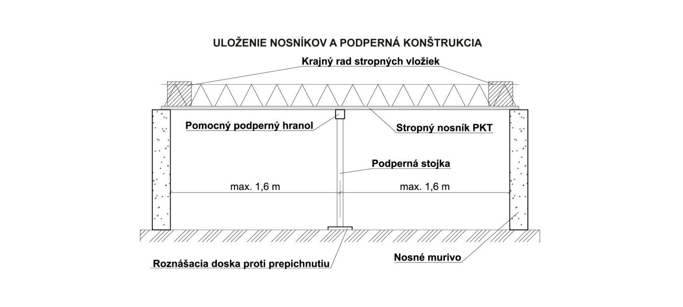 Umiestnenie montážnych podpier musí byť v maximálnych vzdialenostiach 1,6 m. Pod jednotlivé podpery je potrebné umiestniť roznášaciu drevenú dosku alebo hranol, ktorá zabráni zaboreniu podpery do terénu, alebo prepichnutiu stropnej dosky podperou. Pri zhotovovaní stropných konštrukcií vo viacerých podlažiach musia byť podopreté aj stropy, ktoré sa nachádzajú nižšie a takisto aj podpery umiestnené zvisle pod sebou.